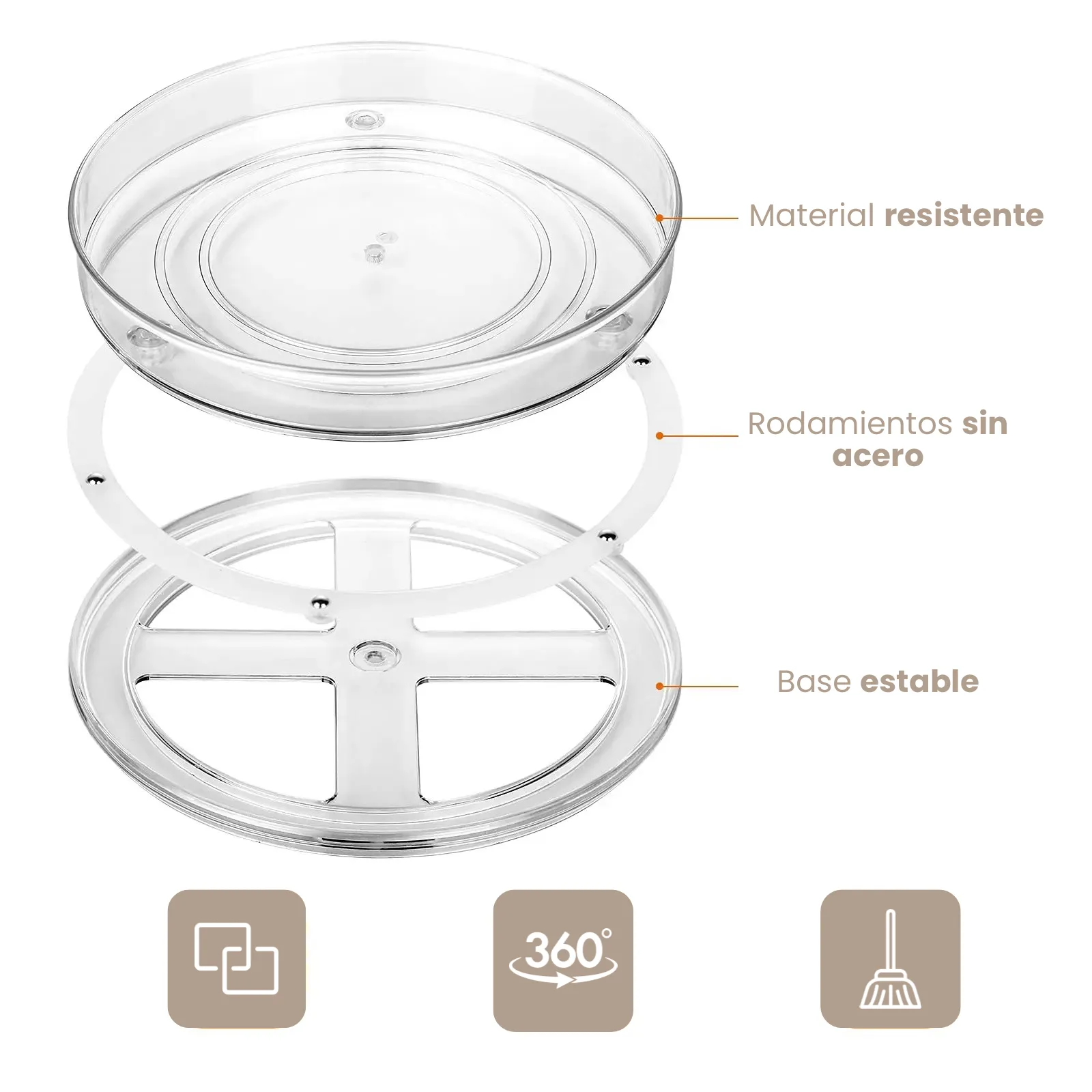 La bandeja giratoria 360 de cloq es un organizador circular y rotatorio de acrílico, perfecta para la cocina, el tocador, la oficina y el baño. Mantén a la mano todo lo que necesitas con comodidad y practicidad. Ideal para especias, condimentos, productos de cuidado personal, oficina, y cualquier cosa que quieras tener siempre a tu alcance. ¡Con cloq tus espacios son más funcionales y ordenados!